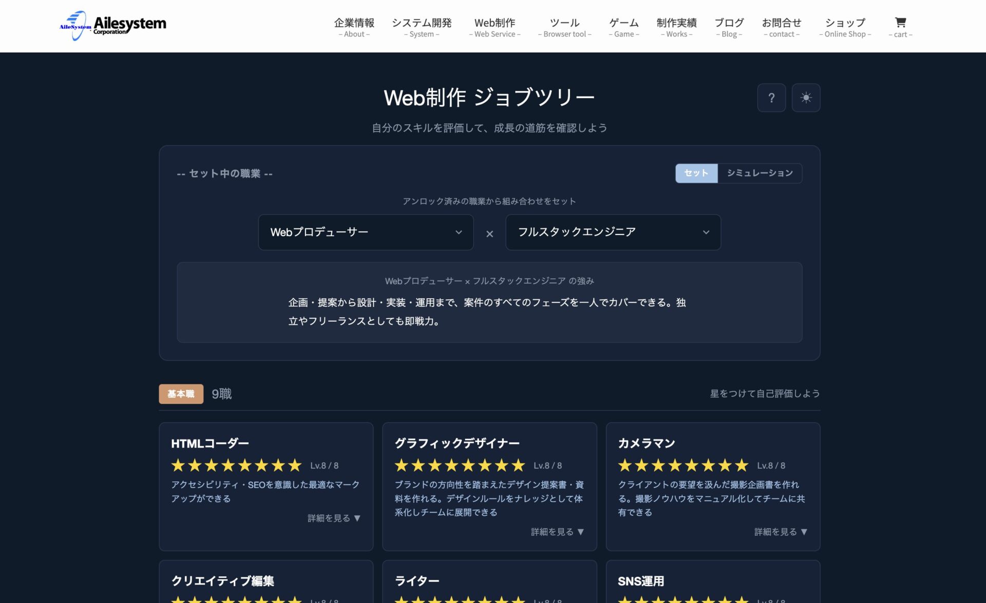 基本職の星が6以上になると、その組み合わせに対応する専門職がアンロックされます。たとえば「グラフィックデザイナー」と「HTMLコーダー」が両方星6以上なら「Webデザイナー」が開きます。