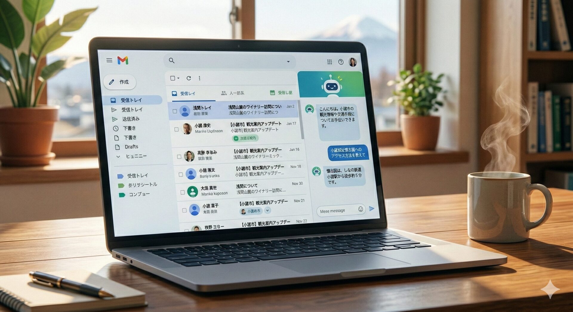 実は、GmailやGoogleスプレッドシートには、Geminiのサイドパネル機能が搭載されています。画面右上のキラキラアイコンから起動でき、メールの要約や数式の提案をその場で頼めます。わざわざ別のページを開かなくても、いつものツールの中にAIがいる状態です。
