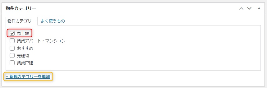 新しく物件カテゴリーを追加する場合は物件カテゴリー名を入力し、「新規物件カテゴリーを追加」を選択します
